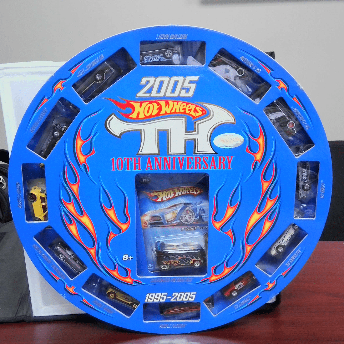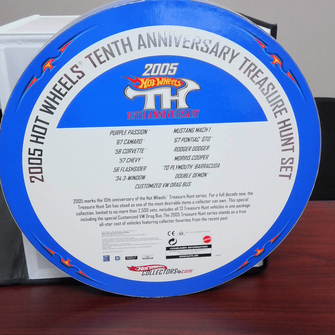 2005 marks the 10th anniversary of the Hot Wheels® Treasure Hunt series. For a full decade now, the Treasure Hunt Set has stood as one of the most desirable items a collector can own. This special collection, limited to on more than 2,500 sets, includes all 13 Treasure Hunt vehicles in one package including the special Customized VW Drag Bus. The 2005 Treasure Hunt series stands as a true all-star cast of vehicles featuring collector favorites from the recent past.